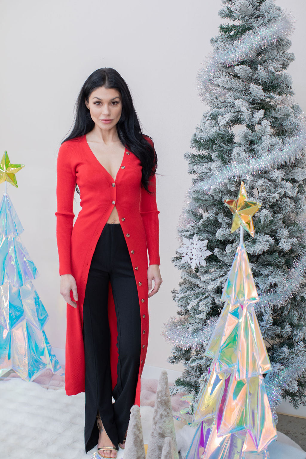 Celebrate the season in a timeless style with the Noel Nights Dress. This ribbed knit button-down dress combines cozy comfort with a sleek silhouette, making it perfect for holiday gatherings, festive dinners, or cozy nights by the fire. It's bold red brings the holiday cheer while the button front design adds versatile styling options.