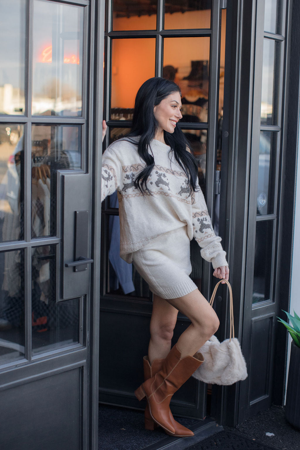 The off the shoulder knit with the reindeer pattern brings a touch of whimsy, while the soft, slouchy design keeps you effortlessly cozy all season long. Pairs well with the matching Frosty Reindeer Knit Skirt.