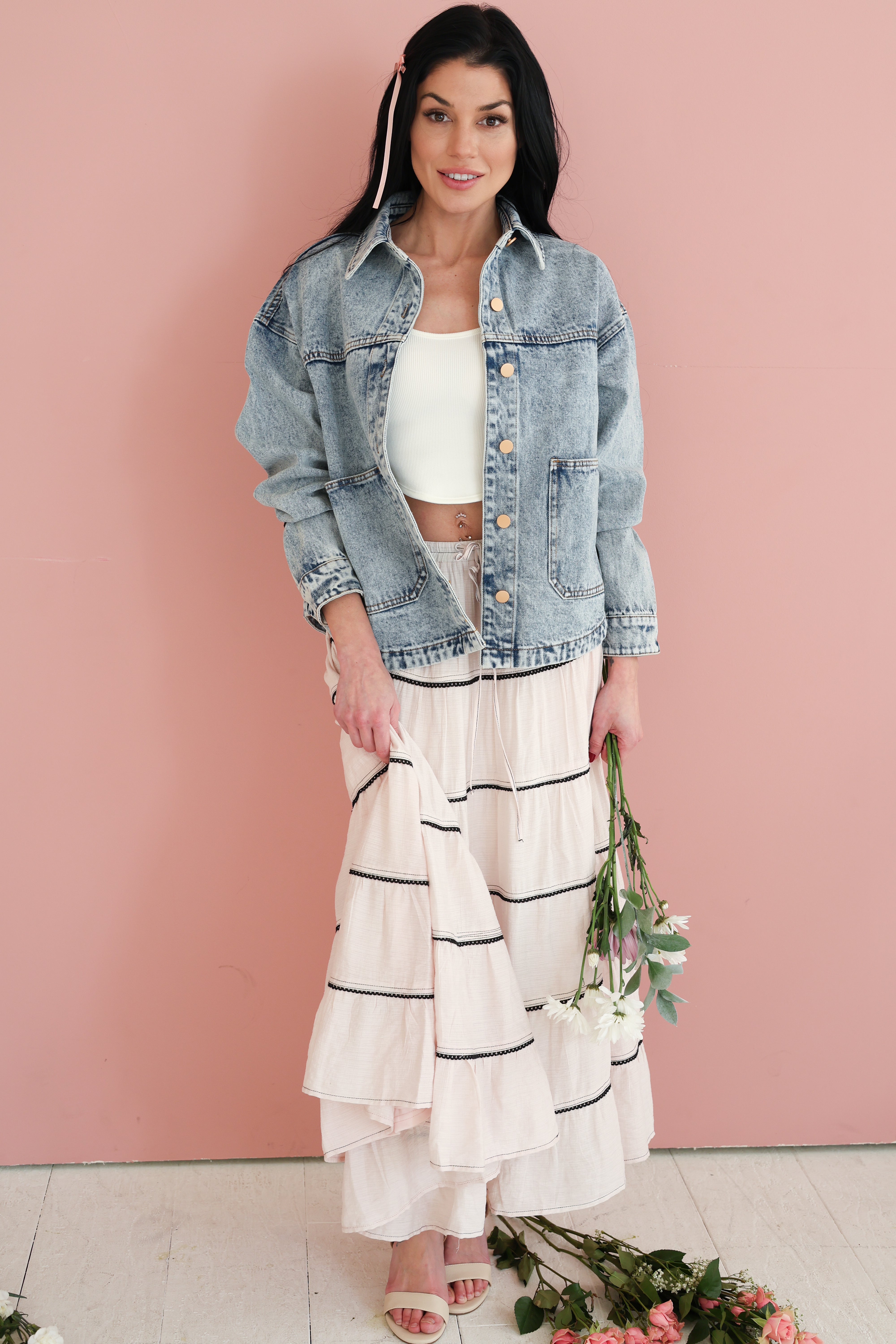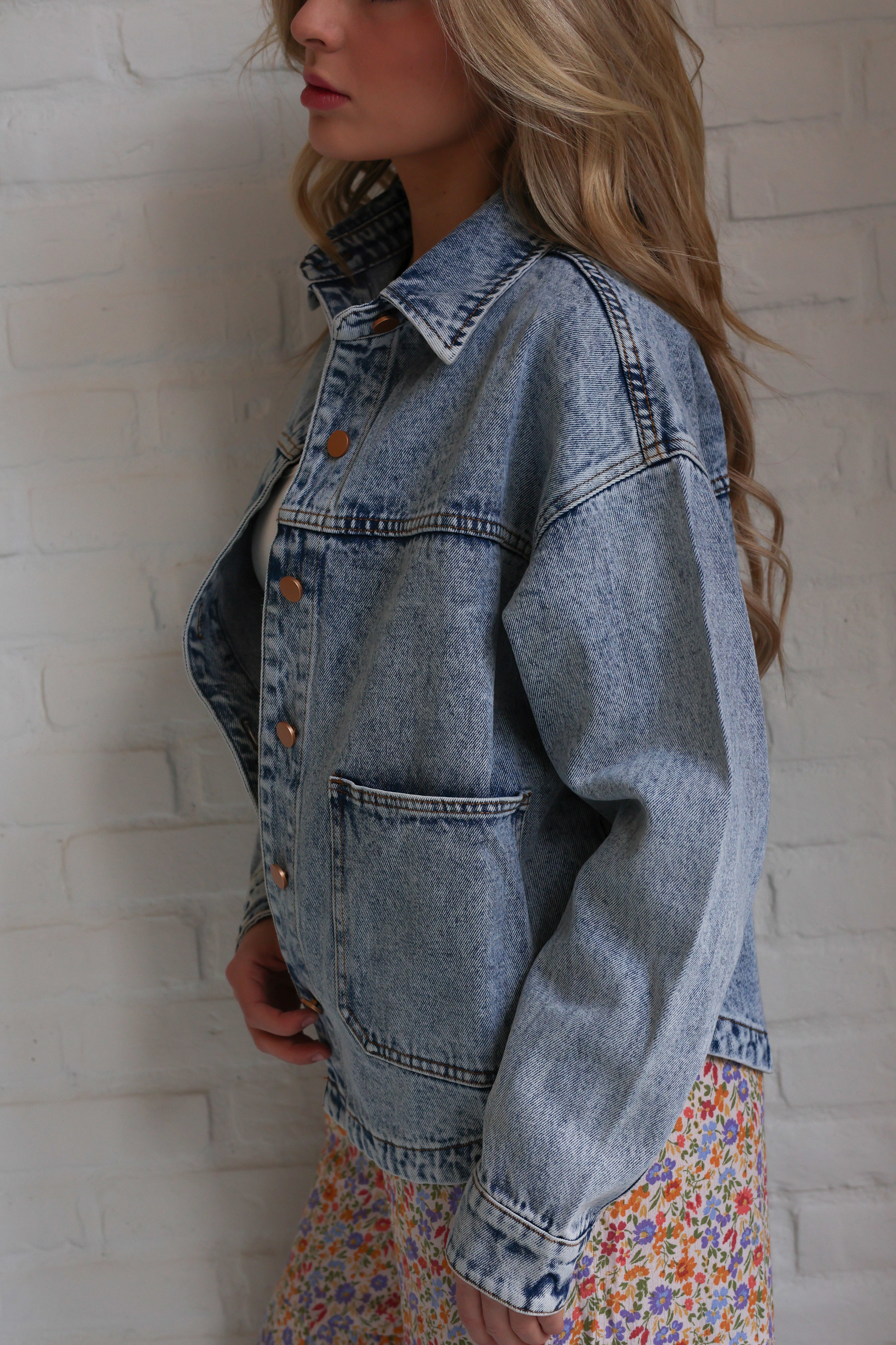 A laid-back, vintage-inspired denim jacket with an effortless, worn-in feel. Designed with a relaxed, slightly cropped fit, classic button front closure, and oversized front pockets, this jacket is the perfect everyday layer. Easy, timeless, and endlessly versatile.