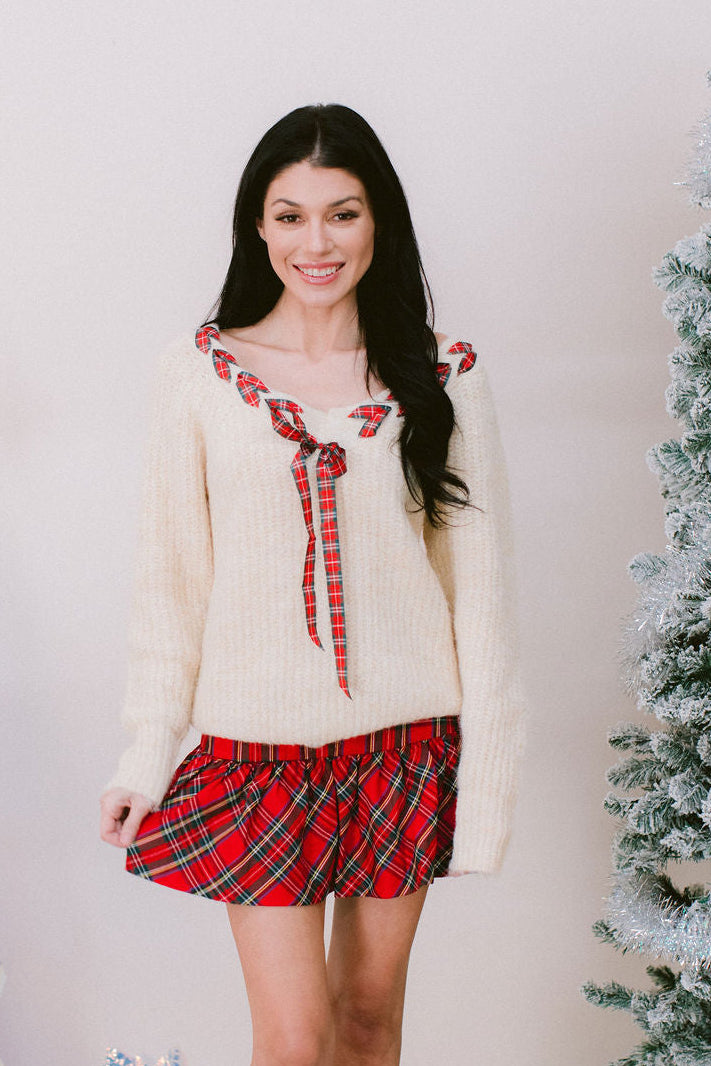 The Merry Me Bow Sweater blends cozy comfort with festive charm. Made from soft, textured knit in a warm cream hue, this sweater features a deep V-neckline followed with the red plaid ribbon lacing that ties into a sweet bow at the front. It's playful yet elegant design make it the perfect piece for holiday gatherings, winter outings, or cozy nights by the fire.