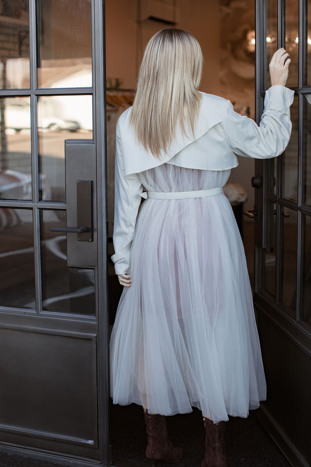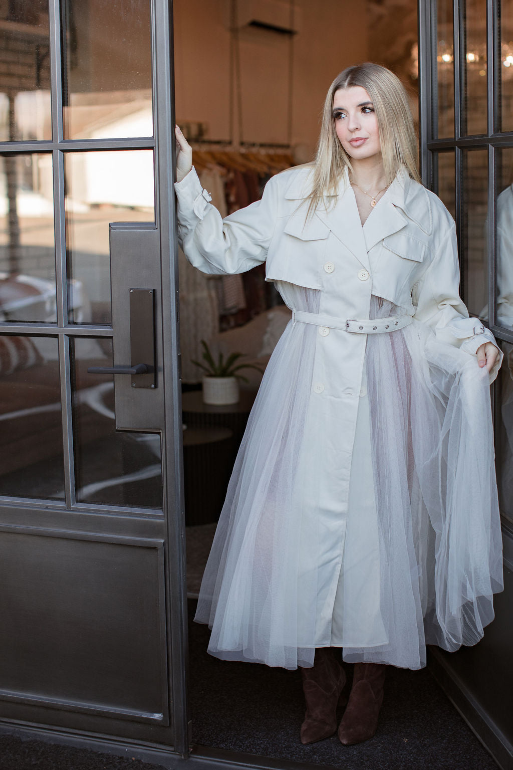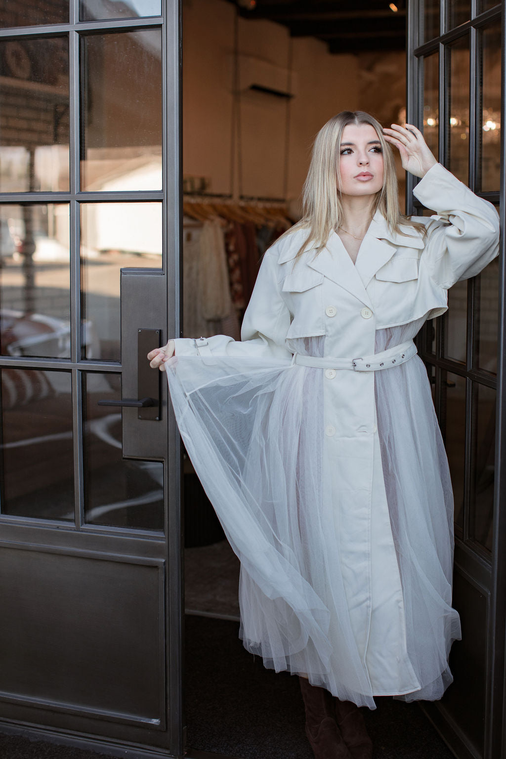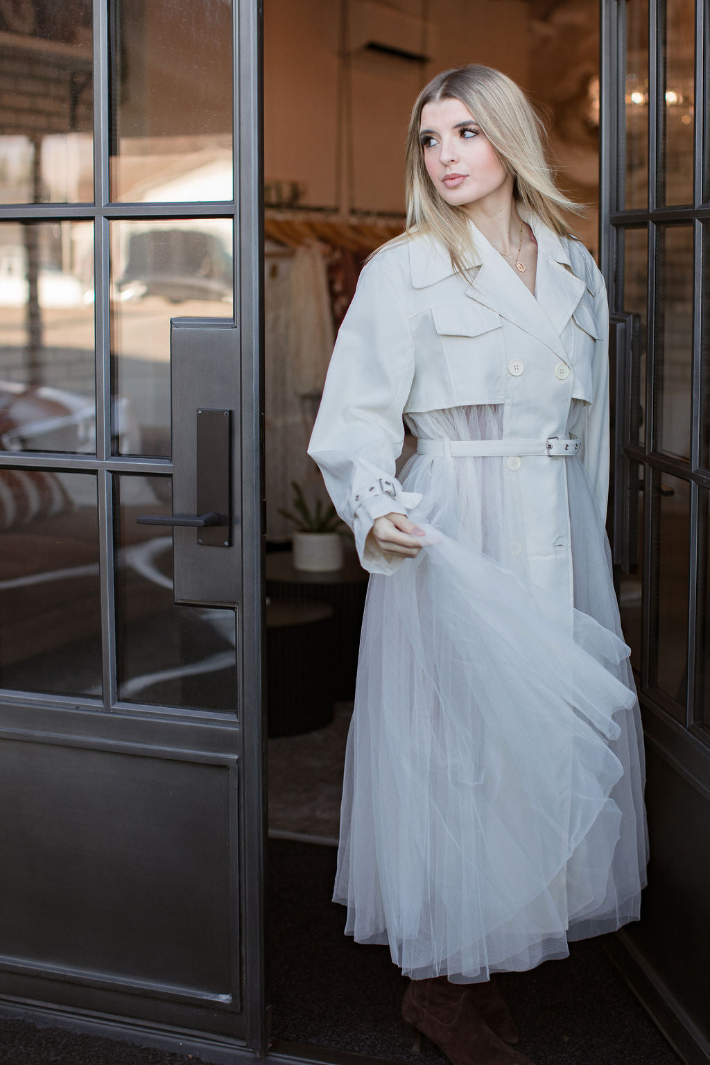 The Swan Trench is elegance with a twist, combining the structure of a classic trench with the softness and movement of flowing tulle. It’s crisp ivory upper pairs beautifully, with the dreamy, ballet inspired skirt, creating an ethereal statement piece that feels straight off the runway. Light, airy, and effortlessly chic, it’s the perfect coat for layering when you want to turn any outfit into a moment.