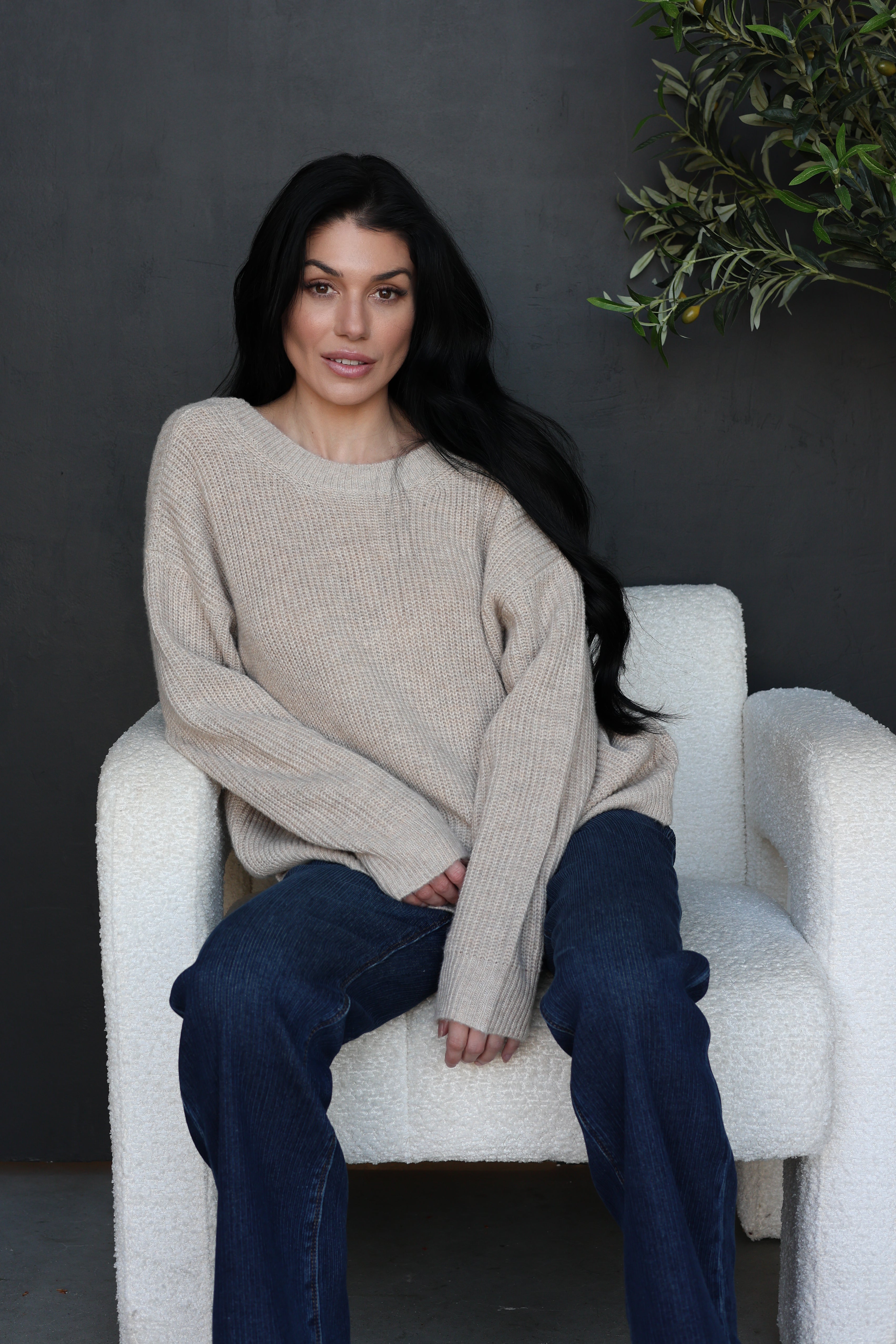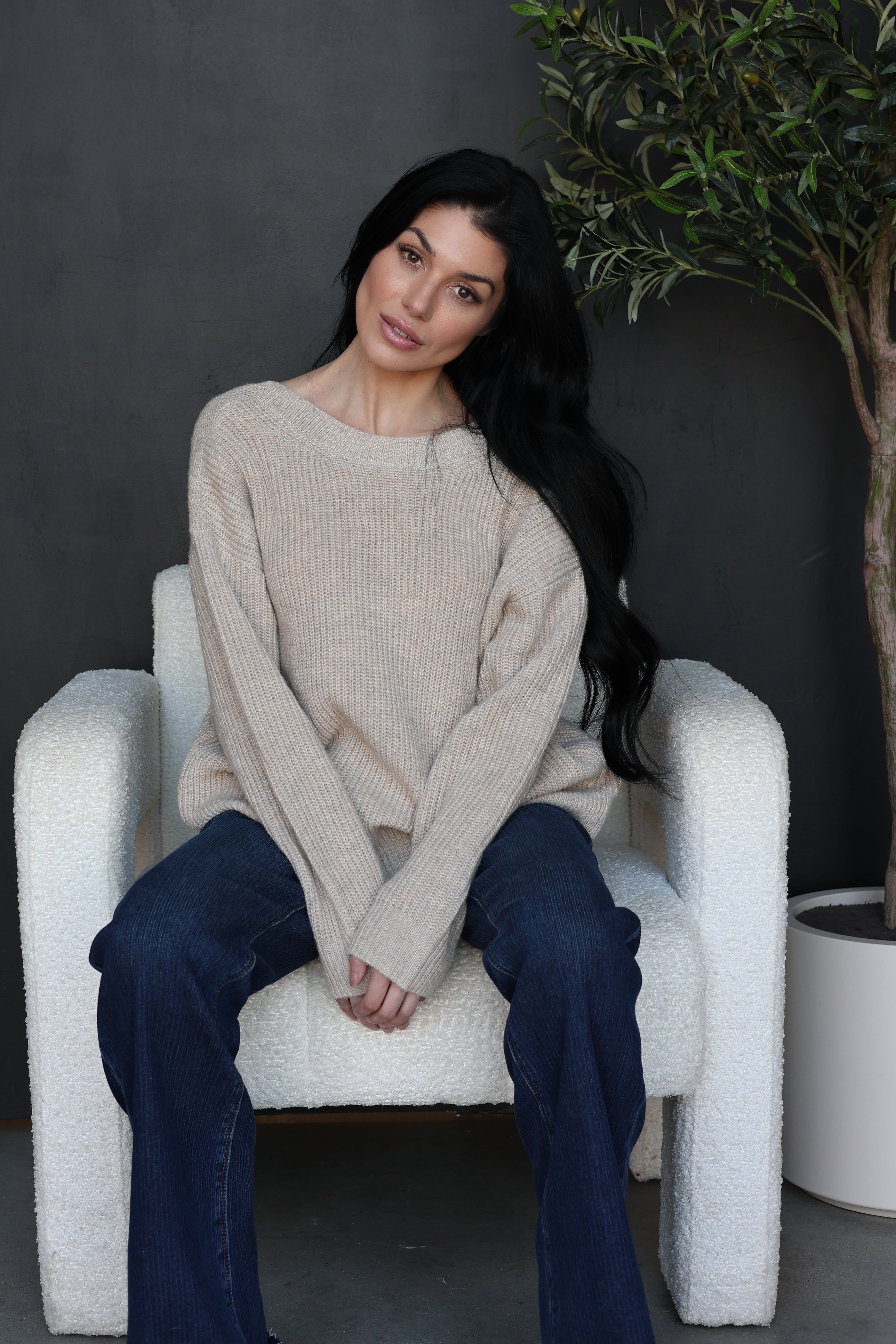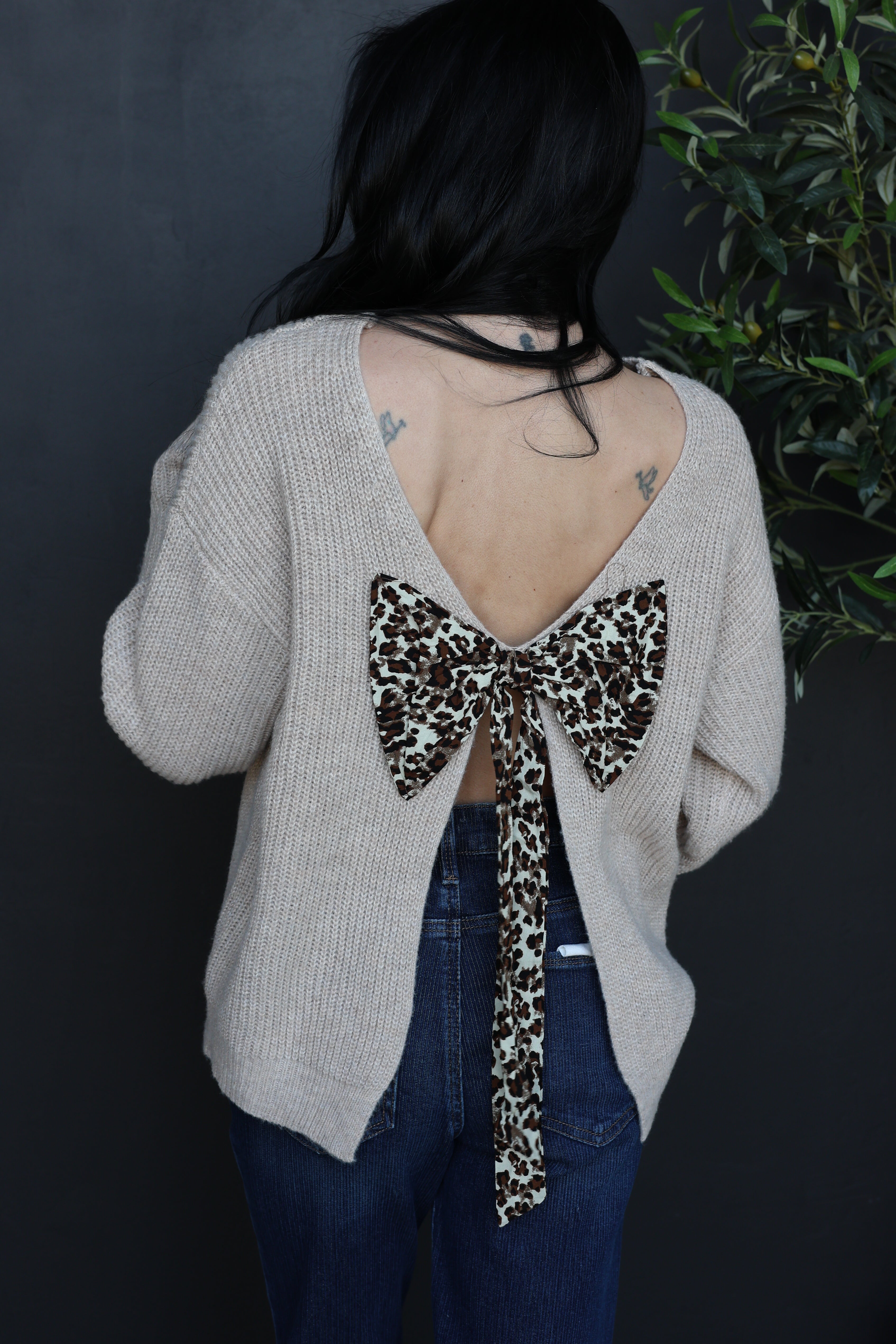 This soft neutral knit sweater brings a fun twist to a classic silhouette with its statement leopard print bow detail. Featuring a flattering V-back and cozy ribbed texture, it’s the perfect mix of sweet and bold, easy to dress up or down.